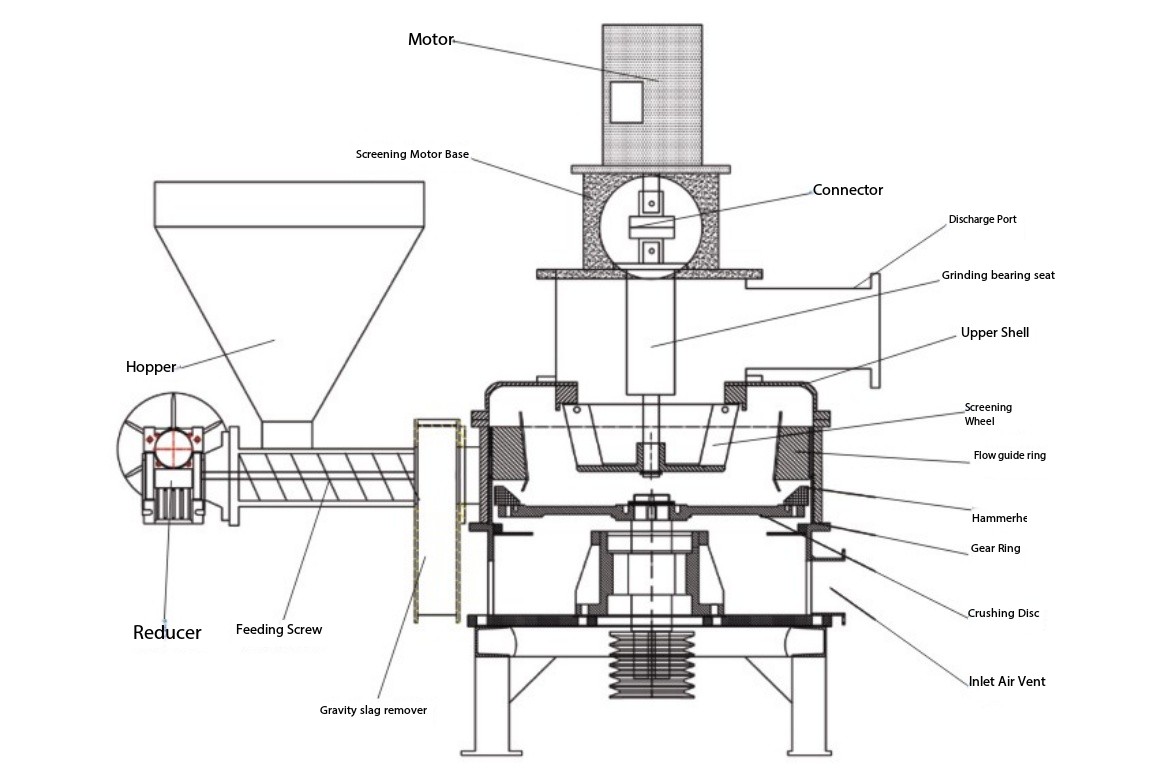 La macchina elimina la necessità di vagli tradizionali, che tendono a intasarsi nelle applicazioni di fertilizzanti. Una girante a gradini controllata da VFD (ruota classificatrice) si trova nella parte superiore della camera. Le particelle che raggiungono la finezza target vengono estratte dalla pressione negativa, mentre le particelle grossolane vengono reindirizzate dalla copertura di guida interna alla zona di macinazione per l'ulteriore lavorazione. Questo processo di "formazione una tantum" riduce la macinazione eccessiva e riduce significativamente il consumo di energia.