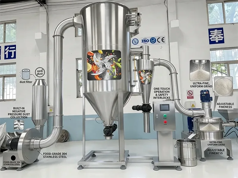 4. Struttura ausiliaria: costruito in un sistema di tiraggio indotto da pressione negativa, nessuna polvere volata durante il processo di frantumazione, mantenendo efficacemente un ambiente operativo pulito; La porta di scarico può essere collegata direttamente al dispositivo di raccolta per ottenere una raccolta rapida della polvere e ridurre al minimo la perdita di materiale; Il fondo del Polverizzatore Ultrafine per Frutta e Verdura è dotato di piedini antiscivolo, che forniscono un'eccellente stabilità durante il funzionamento e riducono efficacemente le interferenze acustiche, creando un ambiente operativo confortevole.
