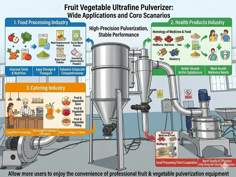 Il polverizzatore ultrafine per frutta e verdura, con il suo vantaggio di frantumazione ad alta precisione e prestazioni stabili, è ampiamente utilizzato in molteplici campi. Gli scenari applicativi principali sono i seguenti: