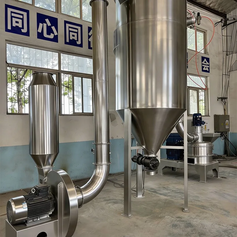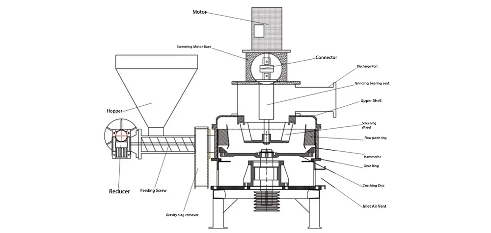 Il flusso di lavorazione specifico è semplice: in primo luogo, alimentare la materia prima in polvere grossolana con una dimensione delle particelle non superiore a 10 mm nella tramoggia di alimentazione, quindi trasportarla nella camera di frantumazione a velocità costante attraverso un alimentatore a frequenza variabile; Il disco di macinazione nella camera di macinazione ruota ad alta velocità, facendo sì che il martello di macinazione e il rullo di macinazione funzionino in modo sincrono ad alta velocità, generando una forte forza centrifuga e gettando la materia prima in polvere grossolana nella parete interna della camera di macinazione; Sotto l'azione della forza centrifuga, le materie prime subiscono forti collisioni, tagli e attriti con piastre di rivestimento resistenti all'usura, martelli e rulli di frantumazione, completando la frantumazione preliminare; Dopo la frantumazione iniziale, il materiale verrà portato nella camera di classificazione dal flusso d'aria a pressione negativa generato dal ventilatore a tiraggio indotto. La ruota di classificazione nella camera di classificazione ruota ad alta velocità per classificare accuratamente in base alla dimensione delle particelle. La polvere ultrafine che soddisfa i requisiti (la dimensione delle particelle può essere regolata secondo necessità) verrà portata nel collettore dal flusso d'aria per completare la raccolta; La polvere grossolana che non soddisfa i requisiti granulometrici verrà intercettata dalla ruota calibratrice e rimandata alla camera di frantumazione per la frantumazione secondaria fino a raggiungere lo standard granulometrico specificato, garantendo l'uniformità della polvere finita.