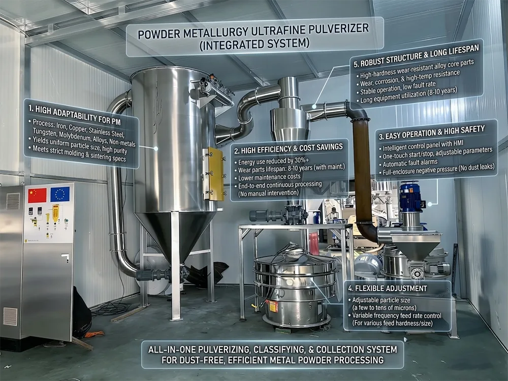Il polverizzatore ultrafine per la metallurgia delle polveri è un'apparecchiatura specializzata sviluppata appositamente per l'industria della metallurgia delle polveri. Viene utilizzato principalmente per la lavorazione ultrafine di polveri metalliche, polveri di leghe e varie materie prime in polvere non metalliche e può adattarsi perfettamente ai requisiti di lavorazione delle materie prime dell'intero processo di produzione della metallurgia delle polveri. Rispetto alle normali apparecchiature di frantumazione, la caratteristica più importante del polverizzatore ultrafine per metallurgia delle polveri è la sua aderenza ai rigorosi standard dell'industria della metallurgia delle polveri, che può controllare accuratamente la dimensione delle particelle della polvere, garantire una distribuzione uniforme delle particelle ed evitare completamente l'inquinamento secondario, garantendo l'elevata purezza della polvere finita e soddisfacendo pienamente i requisiti fondamentali della successiva formatura, sinterizzazione e altri processi.