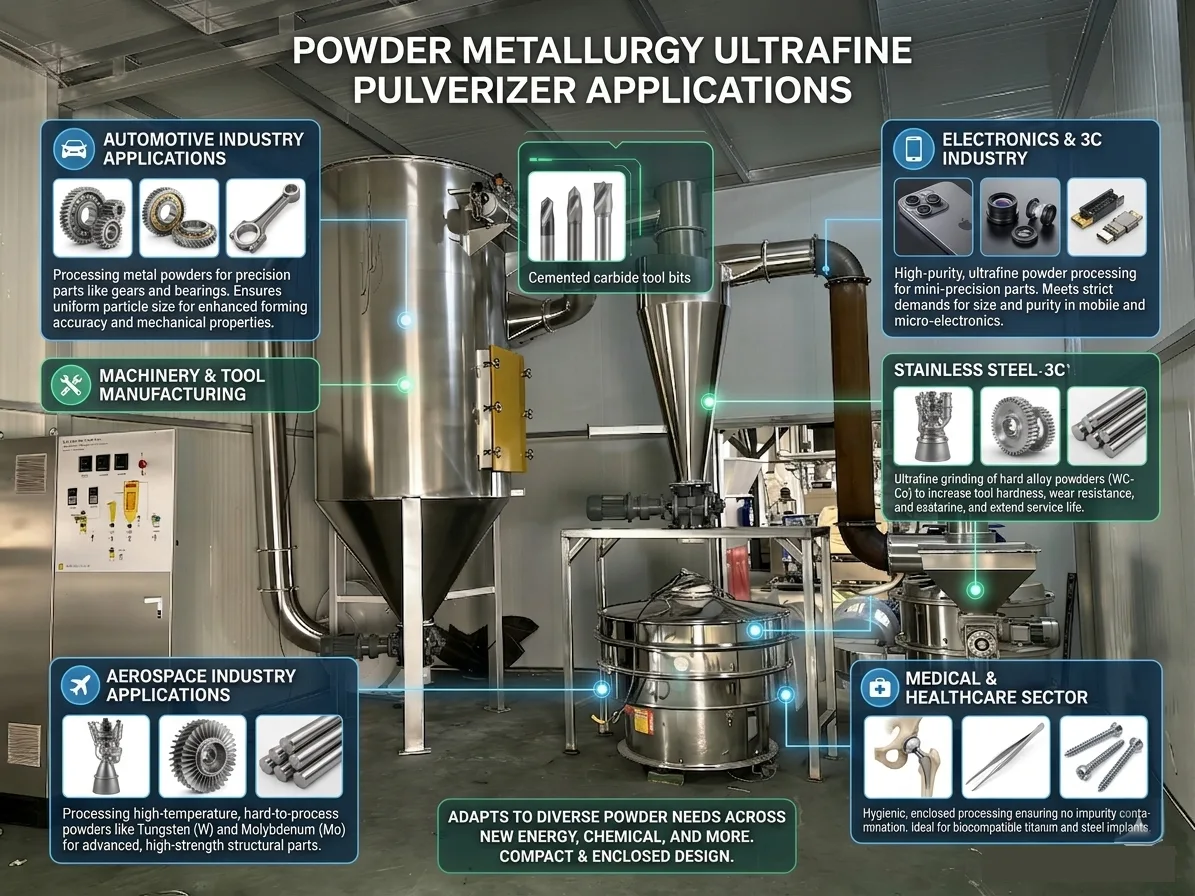 Il polverizzatore ultrafine per metallurgia delle polveri viene utilizzato principalmente per la lavorazione ultrafine di materie prime nell'intero settore della metallurgia delle polveri e può adattarsi al trattamento di frantumazione di varie polveri metalliche, leghe e non metalliche. È ampiamente utilizzato in molteplici campi come quello automobilistico, dei macchinari, dell'elettronica, dell'aerospaziale, della medicina e della produzione di utensili. Gli scenari applicativi specifici sono i seguenti: